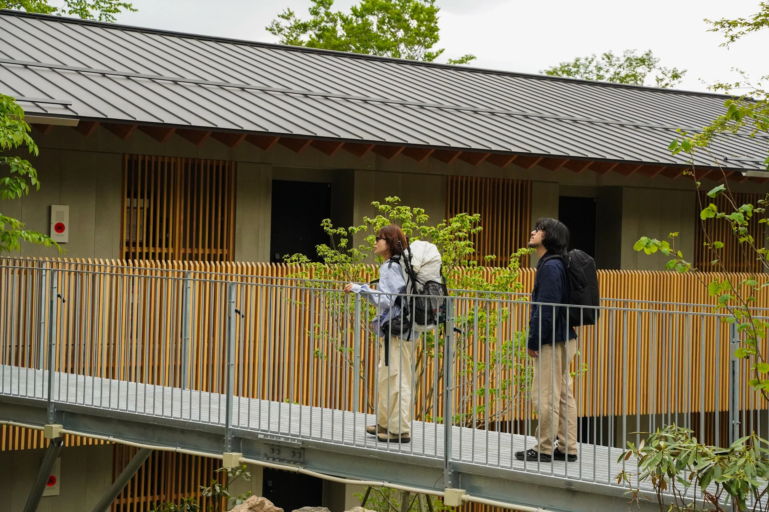〈SANU STUDIO RAY〉はキャビン型とは異なる連棟タイプ。まっすぐに伸びた庇(ひさし)が印象的な外観は、森の中にそっと浮かぶ隠れ家のようだ。