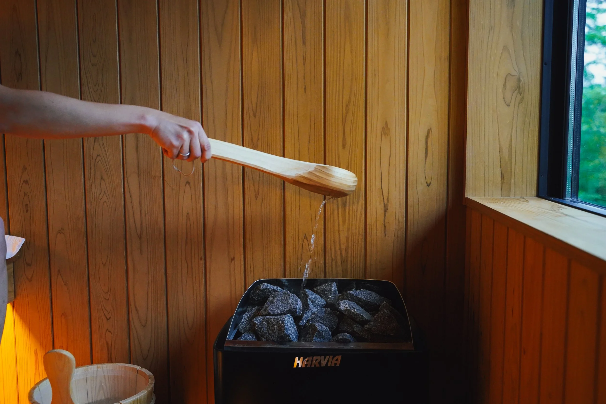 ロウリュでじんわりと汗をかき、そのまま隣の水風呂へドボン!火照った体に、ひんやりとした水が心地よくしみわたる。