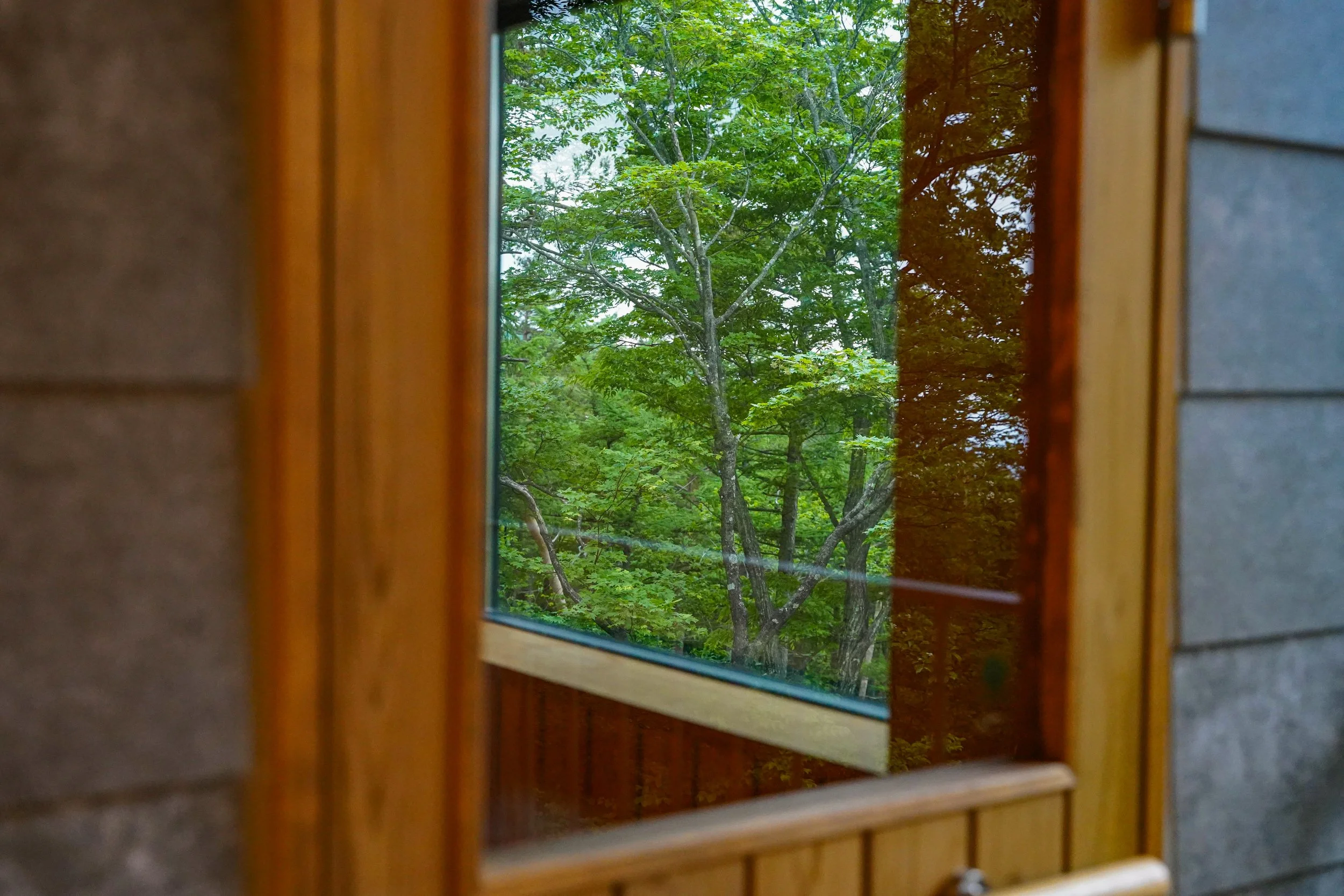 窓からはやわらかな光が差し込み、森の景色がそのまま一枚のアートのように広がっていた。