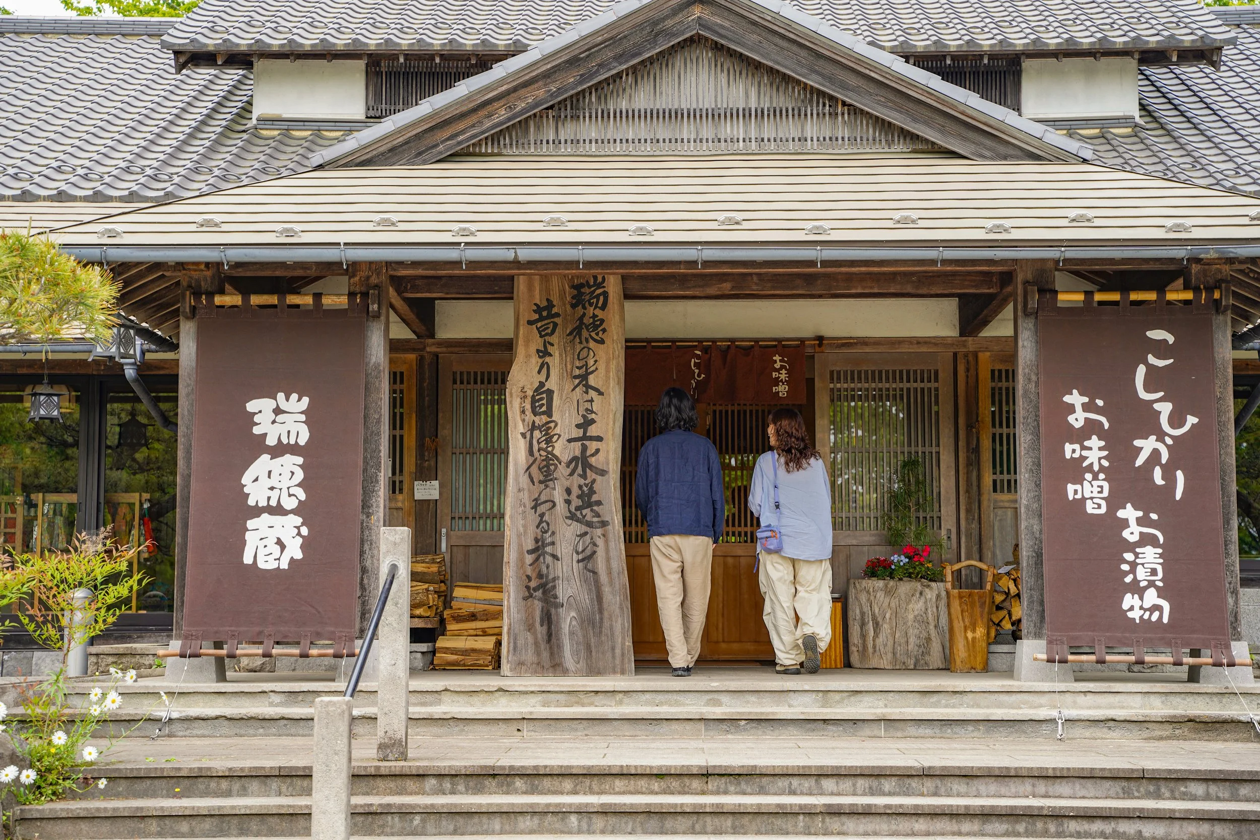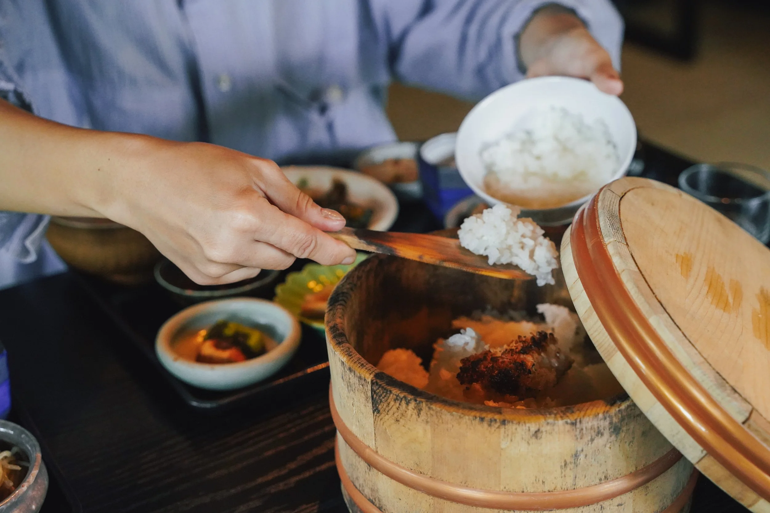 かまど炊きのごはんが人気の和食処。ふっくら炊き上げたお米を、おひつでたっぷり味わえる。畳の座席でゆったりと過ごせる店内は、旅のスタートにぴったり。隣接する土産処では、地元の調味料やお米も販売されている。