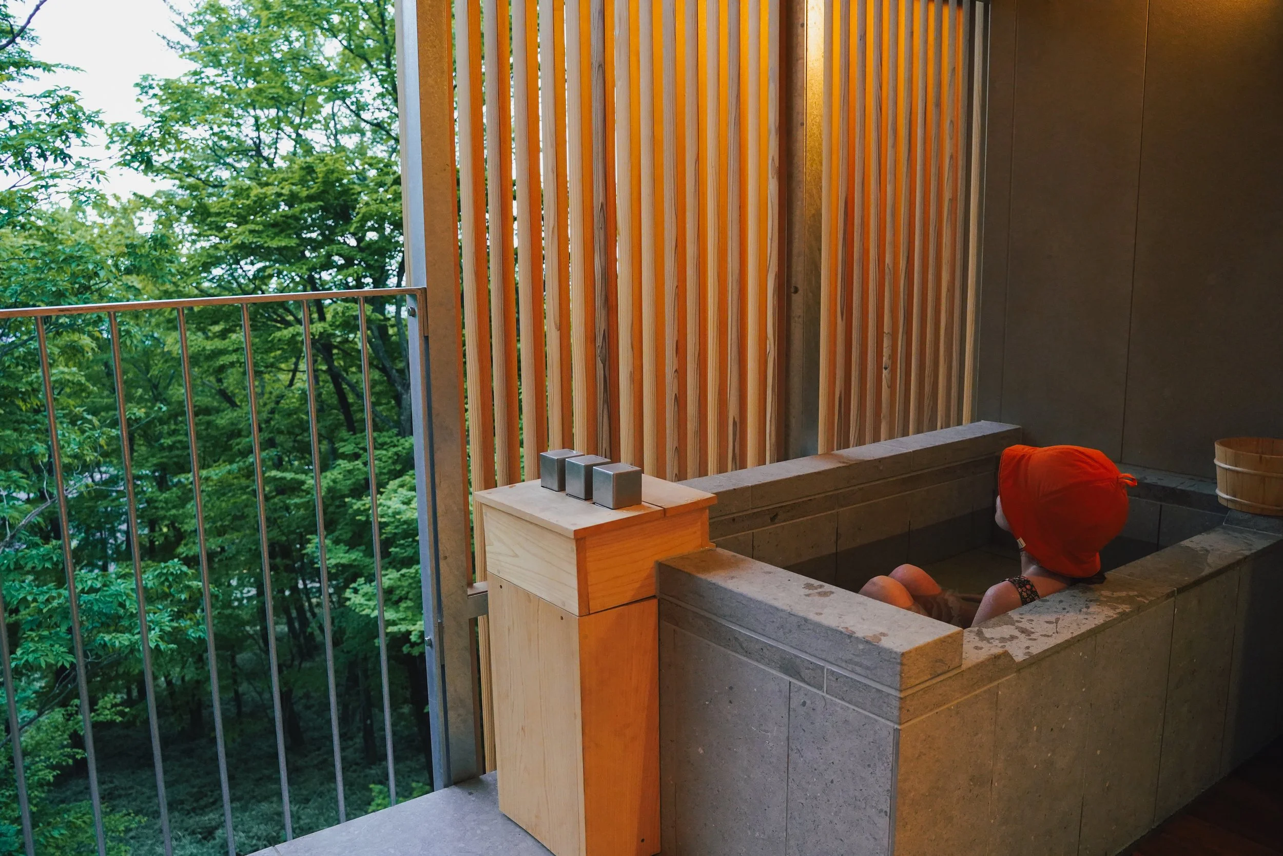 そう、ここには本物の温泉が引かれていて、森を眺めながら、好きなときに、好きなだけ湯に浸かれるのだ。