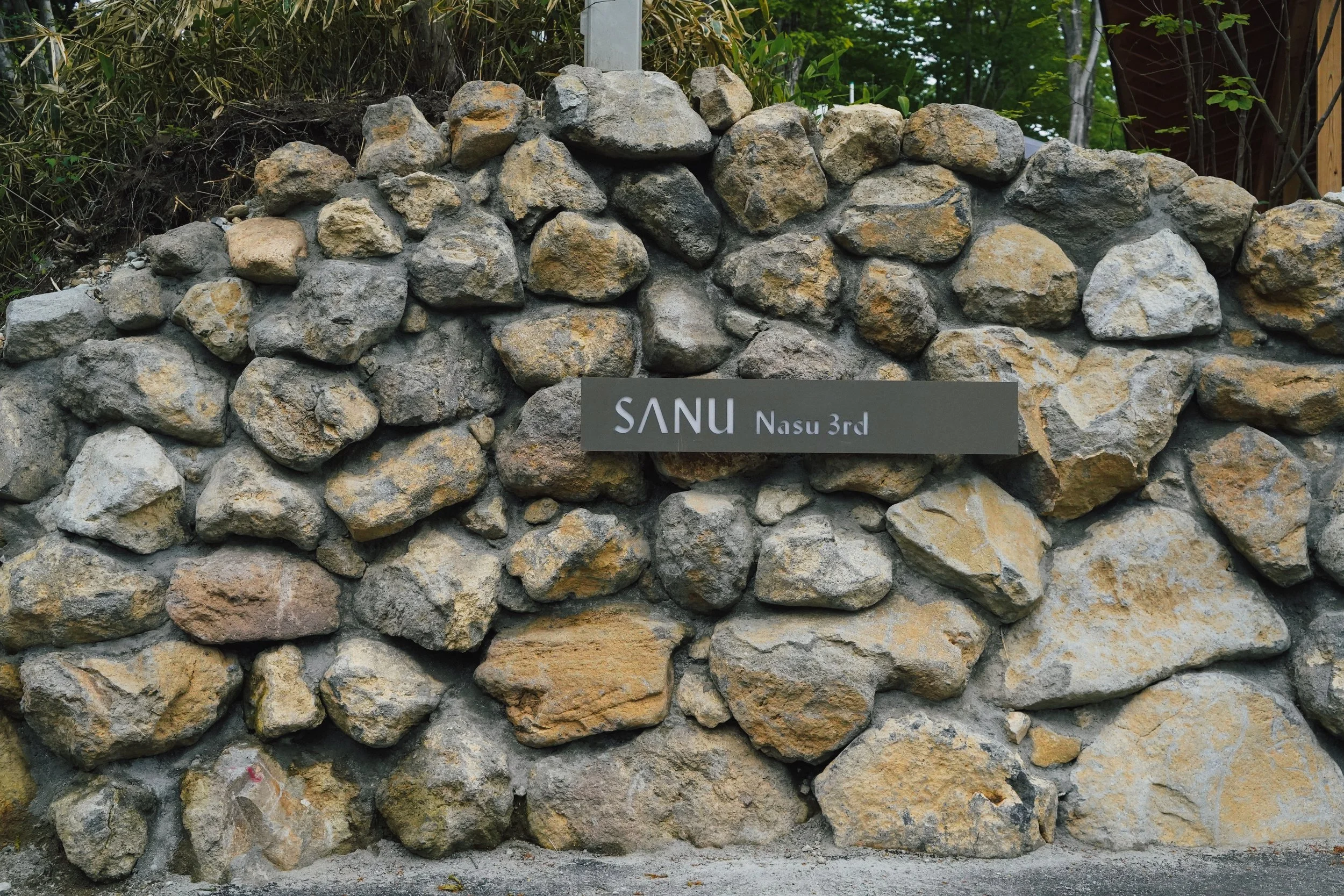 今夜の宿、SANU 2nd Home 那須3rdがあるのは、木々が深まる山道の先。目印の石垣看板が見えてくると、気持ちも自然とほぐれてくる。
